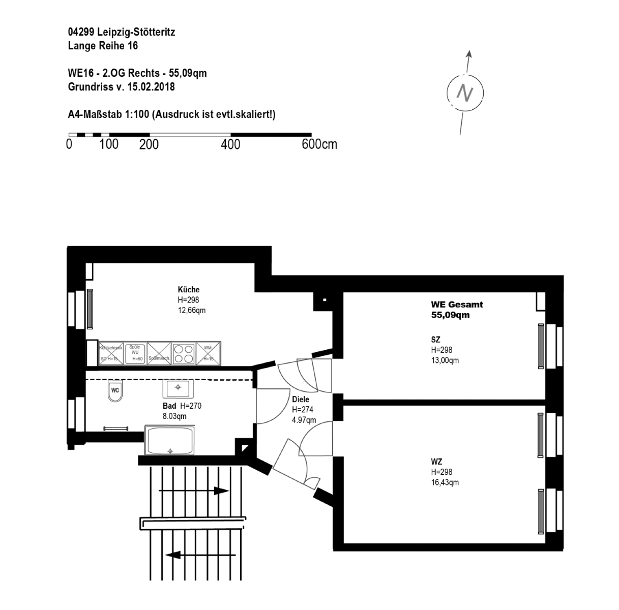 - WE16 OG2 Rechts - 55.09qm - 2 Zi., Bad, Küche / Keller ca. 8.8qm