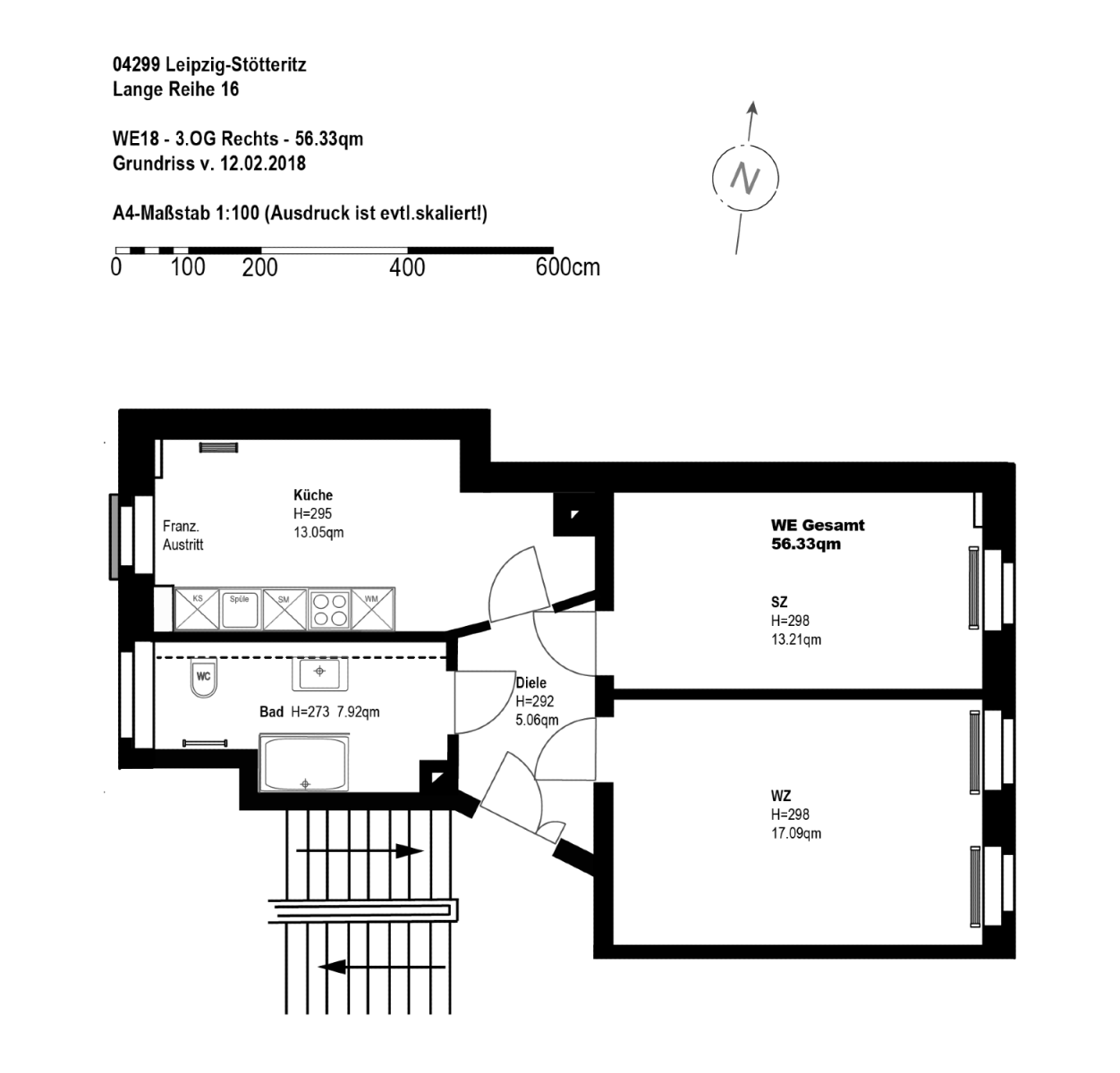- WE18 OG3 Rechts - 56.33qm - 2 Zi., Bad, Küche / Keller ca. 8.7qm