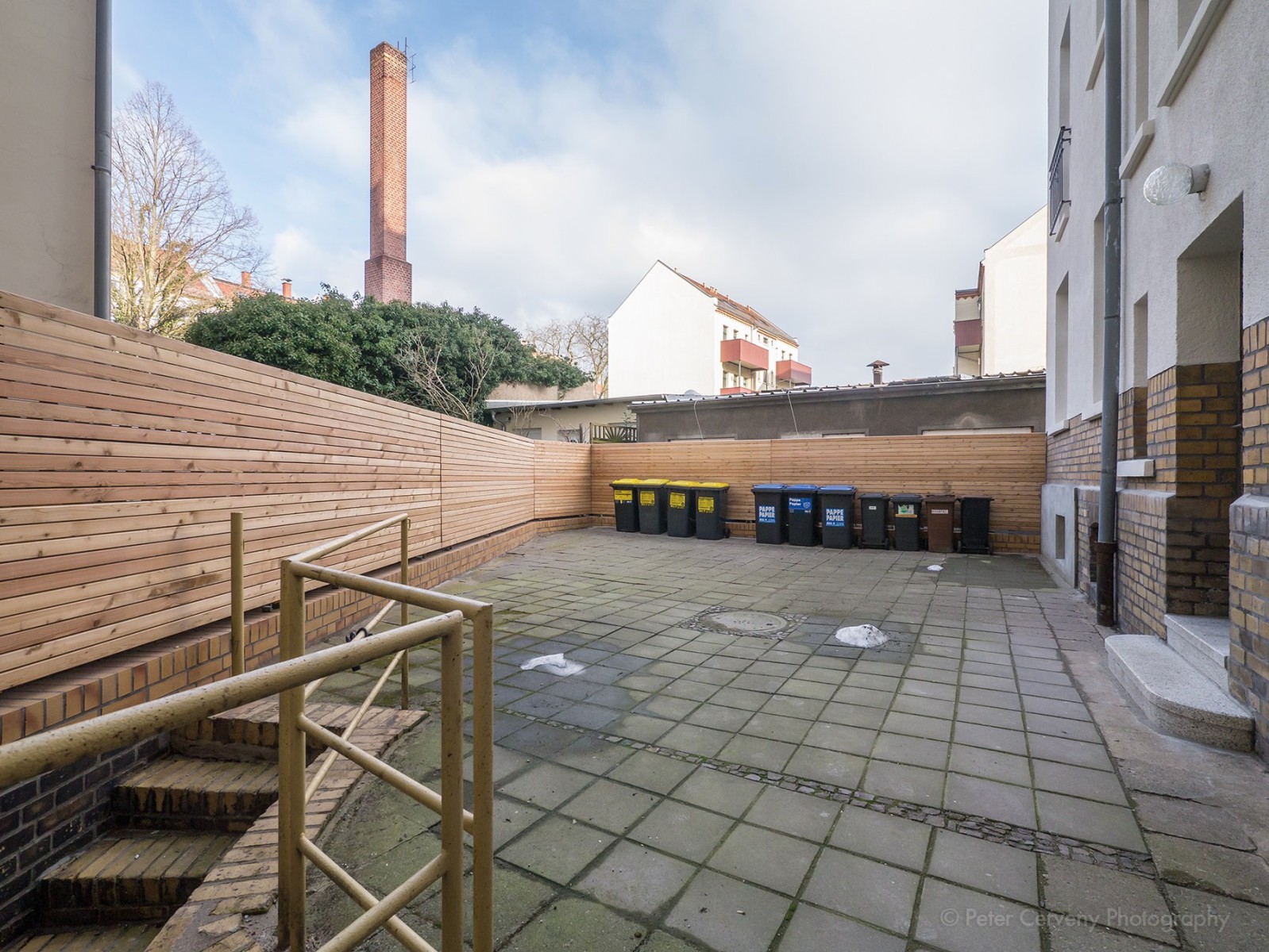 - Vom Treppenhaus zugänglicher Hof mit neuem Zaun in Sibirischer Lärche